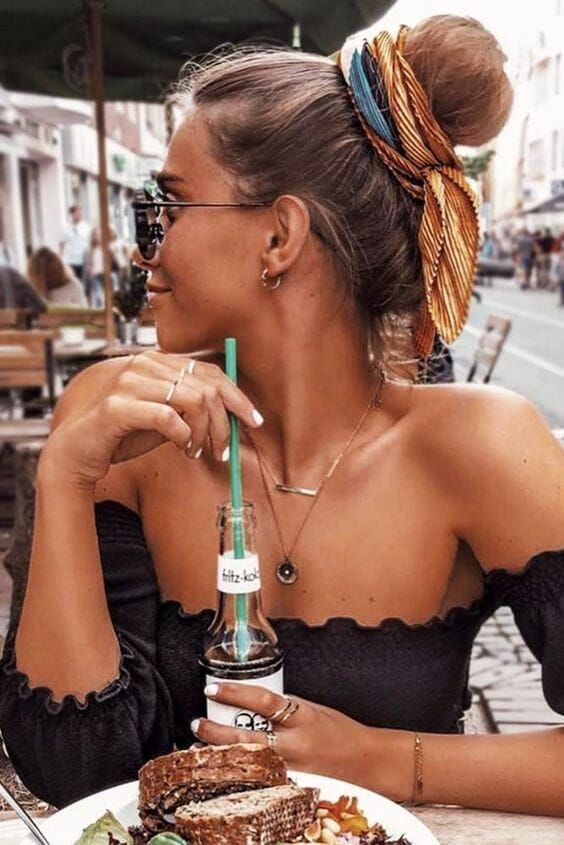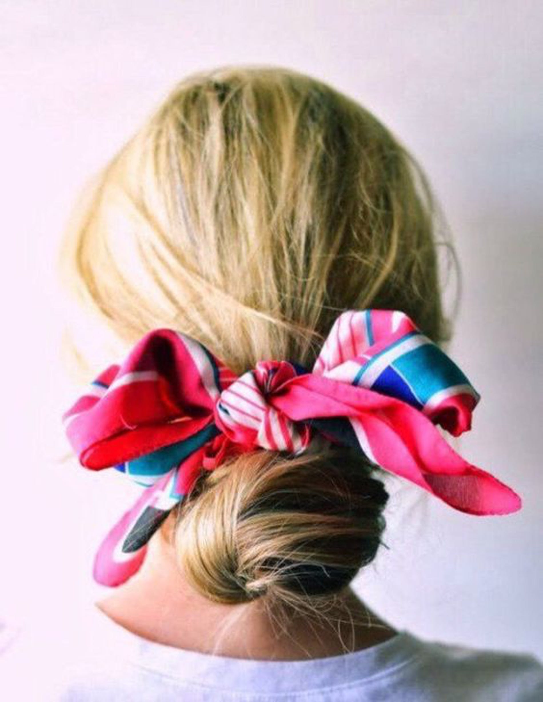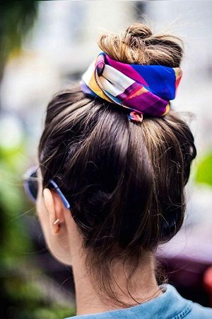 Basta fazer um coque bagunçado ou clássico e simplesmente enrolar o lenço em volta da base algumas vezes para criar esse visual que fica lindo, sem nenhum esforço.
