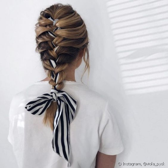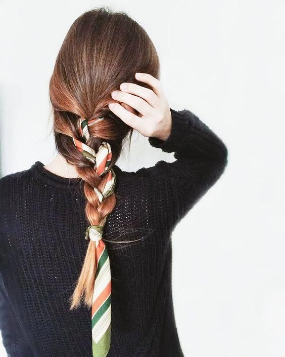 Para aderir a este estilo, apenas amarre o lenço (dê preferência a um de seda bem fino) ao redor da base do seu rabo de cavalo e use-o como uma das três “seções” da trança e finalize com um laço na parte inferior e pronto!