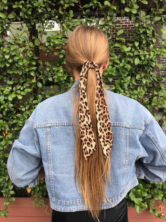 Um lenço pode ser uma maneira fácil de adicionar cor ao visual, deixando-o mais casual. Basta fazer um rabo de cavalo, amarrar o lenço em torno da base e deixar as pontas soltas. Fica lindo com lenços de seda retangular associados a uma estampa divertida!